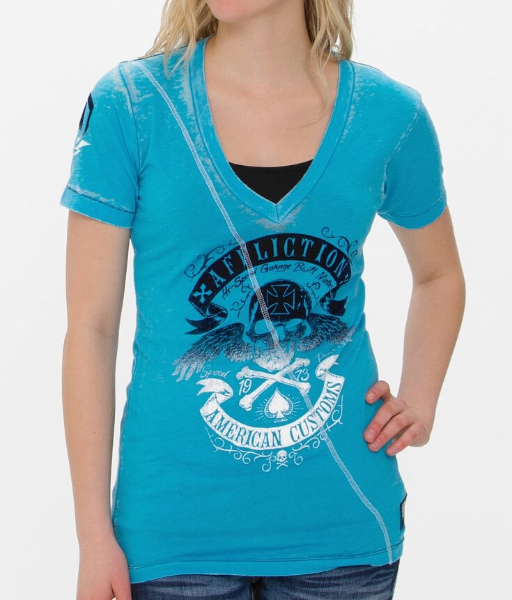 Distressed graphic burnout v-neck t-shirt Flocking and contrast coverstitch accents "Affliction" patch Body length 28" on size medium Model Info: Height: 5'8" Bust: 35" Waist: 27" Hip: 38" Wearing Size: Medium