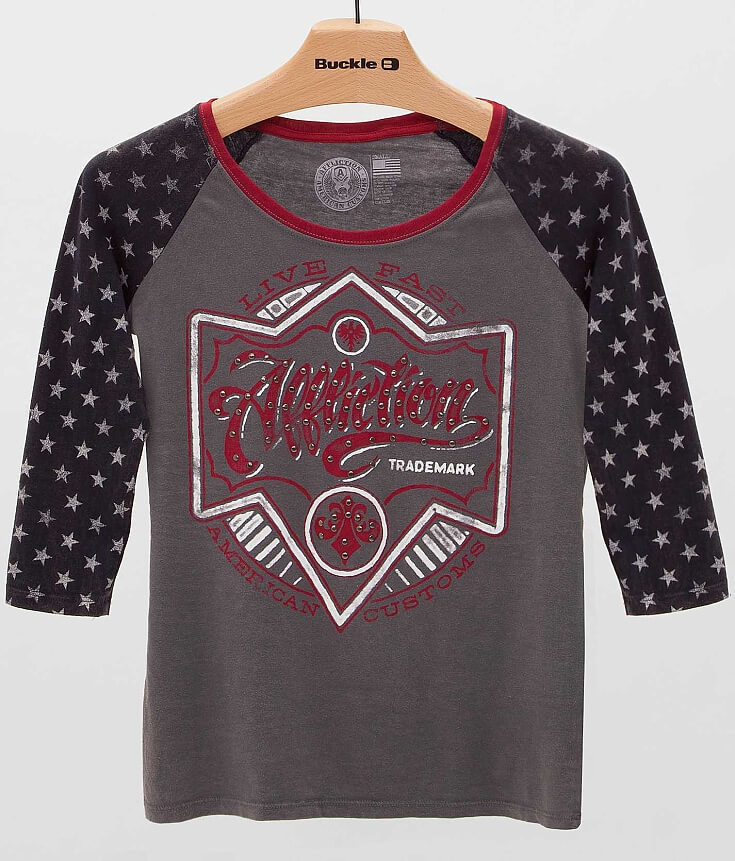 Distressed graphic raglan sleeve washed t-shirt Stud accents Body length 25 1/2" on size medium Model Info: Height: 5'10" Bust: 34 1/2" Waist: 27" Hip: 38 1/2" Wearing Size: Small